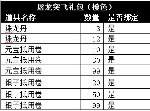 描述:“屠龙突飞礼包”助您在屠龙战场中能力突飞,海量经验、威望等你拿!
