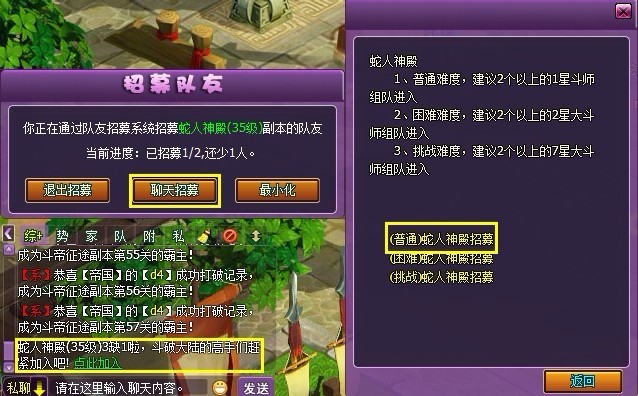 首先选择挑战的难度,再点击聊天招募,系统会在聊天框中发布招募信息,其他玩家可以点击“点此加入”来加入你的队伍