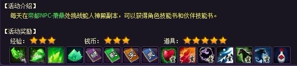 蛇人神殿副本是美杜莎女王的神殿。美杜莎女王手下有魅蛇部落,墨蛇部落,炎蛇部落,花蛇部落四大部落。击杀副本中的四大部落首领月媚、墨巴斯、炎刺、花蛇王和美杜莎女王之后,可以获得丰厚的道具奖励!