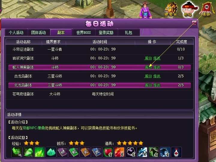 (1)点击地图旁边『活动』→『副本』→蛇人神殿副本,点击“前往”即可自动寻路前往蛇人神殿副本NPC萧鼎处。