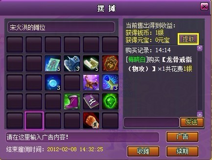 买家进行购买操作后,卖家的摊位上会显示信息,此时可以选择提取,或者在收摊后系统会进行金额结算,扣除3%的手续费,所余则会发送到卖家背包中。