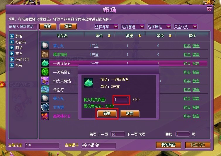 选择想要购买的物品点击购买,输入购买数量,再点确定,系统就会扣除相应元宝并将物品发送到买家背包中