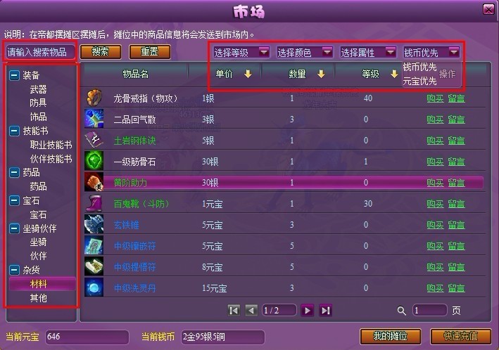 点击后出现市场界面,玩家摊位上出售的物品都可以在市场中搜索到,市场功能提供精确搜索和模糊搜索,玩家可以输入想要购买的物品名称来搜索,也可以选择种类,等级段,属性等来搜索。