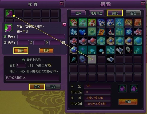 1. 提取摆摊收益:如果有人购买了你的道具,就可以随时通过点击背包中的『摆摊』按钮,在摆摊界面的右上角的『提取』按钮处领取自己赚到的元宝或钱币。