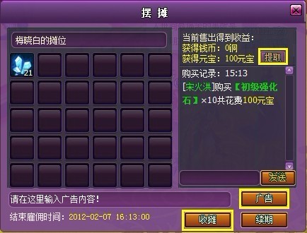 在你的摊位界面中,还可以使用一定的钱币来编辑你的个性广告语宣传你的摊位,在广告发出后,聊天框里就会显示你的广告了,其他玩家可以点击绿色字体链接来查看你的摊位。
