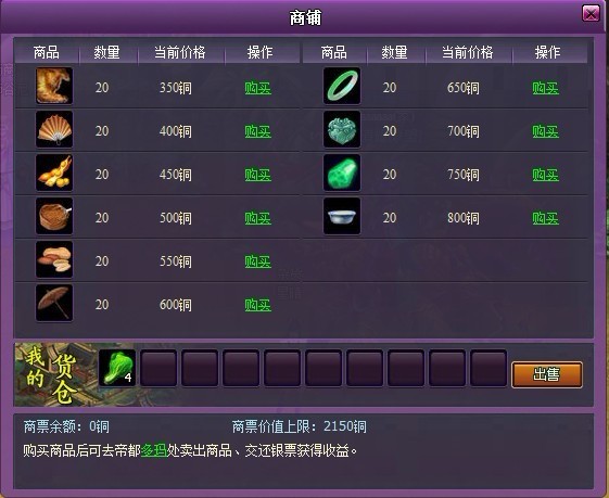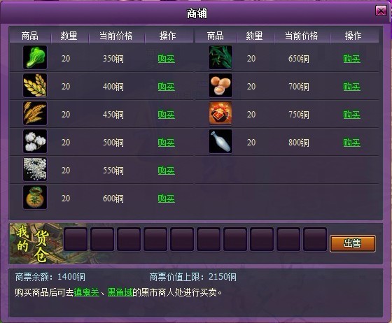 2.打开商贸商店,选取想要购买的货物,商票的余额只有1400铜,挑选货物的时候要仔细,尽量购满余额。