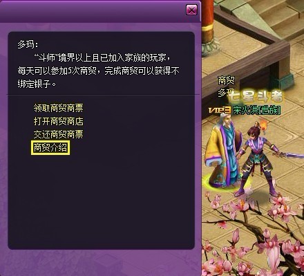 1,达到斗师境界以上已加入家族的玩家可以来到帝都商人多玛处,与之对话,领取商贸商票。(可以查看商贸介绍,里面详细的说明了商贸规则,第一次接触的玩家可以先看一下)