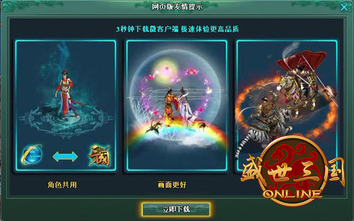 微客户端是提供用户最小的客户端下载,保证用户能够尽快开始游戏。在游戏过程中,逐渐下载更多内容,保证游戏顺利展开。 当今社会无论做什么讲的就是速度快、效率高、有效又实用,陪游盛世三国也是如此,在这里画面更好、PK更流畅、角色公用,你还在等什么呢?陪游盛世三国3秒下载微客户端,为你减少下载阶段的等待时间,极速体验更高品质,尽快进入游戏完成你的英雄征程。